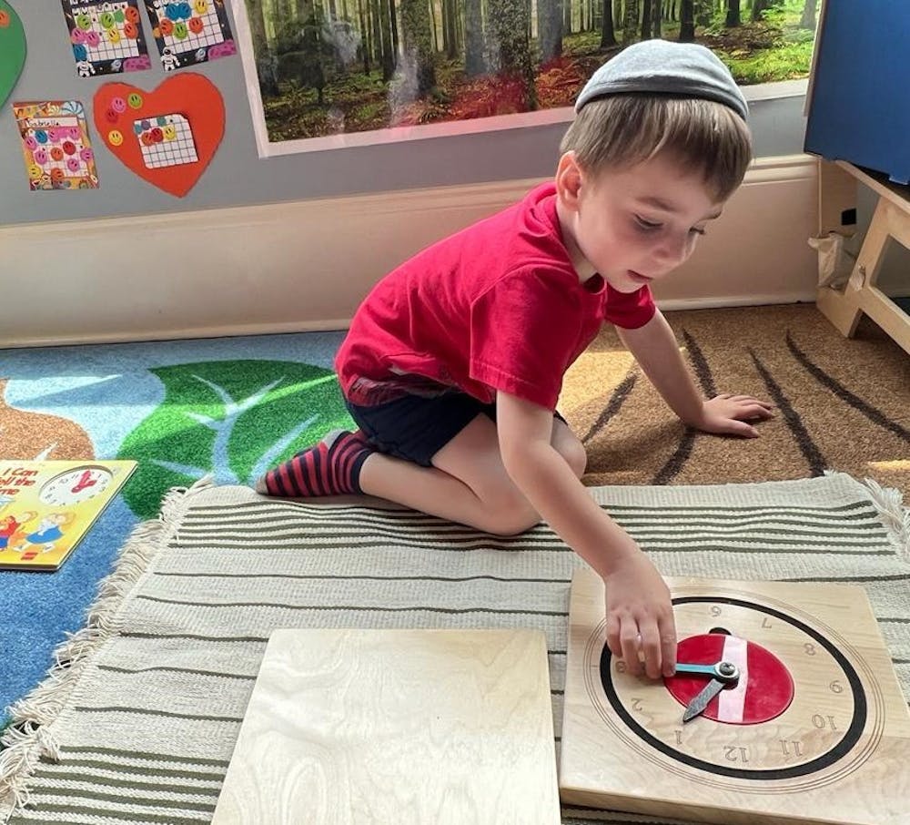 Children at the Revere Jewish Montessori Preschool learn to tell time with the hands-on Montessori method, while others play with the water table and learn to forge and create water paths and falls in the beautiful outdoor playscape.
